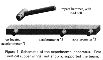 An impact hammer fitted with a force transducer (PCB Piezotronics Model 208-B03) was used to excite the beam, perpendicular to the suspension direction. Three accelerometers (Wilcoxon Research Model 736) captured the vibration response of the beam, including a co-located driving point measurement for mass normalisation of the mode shapes.