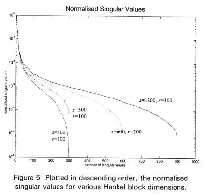 The influence of the Hankel matrix block dimensions, r and 5, on the realised poles was investigated. Figure 5 shows the result of plotting, in descending order, the normalised singular values for various Hankel block dimensions.