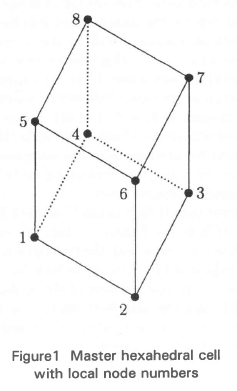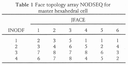 • NODSEQ(INODF,JFACE) is the local node number of the INDOF-th node of the JFACE-th face of a cell (or the master cell). Consider the master hexahedral cell shown in Figure 1. The associated face topology array NODSEQ is given in Table 1. The columns give the (local) numbers of the nodes associated with the cell faces 1 to nf = 6. The fourth cell face, for example, is defined by the set of nodes f4= {1,5,8,4}T.