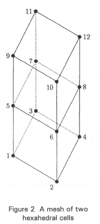 Two typical neighbouring hexahedral cells are shown in Figure 2. In this case the internal face defined by the nodes 5, 6, 8, and 7 is shared by the cells and thus forms the interface between the two cells. It is normal practice to specify the nodes which define each face of a cell according to the right-hand rule such that the unit vector normal to each face points outwards. This means that the sequence in which the nodes for the shared face will be specified for the lower cell in Figure 1, will be the reverse of the sequence for the upper cell. This can be seen in Table 4 when the records for faces 3 and 12 are compared.