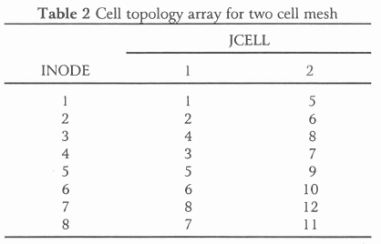 • KCELL(INODE,JCELL) is the global node number of the INODE-th node of cell JCELL. The cell topology array, for example, for the two cell mesh (model) shown in Figure 2 is given in Table 2. The second cell, for example, is defined by the set of global nodes c2 = {5, 6, 8, 7, 9, 10, 12, 11}T.