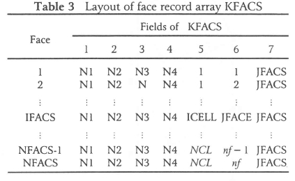• KFACS(IFACS,J) is the J-th field of the record of the IFACS-th face. An illustration of the layout of the face record array KFACS is shown in Table 3. Nl to N4 are the numbers of the global nodes associated with the face IFACS, with N1 the smallest nodal number and the rest in right-handed order. ICELL is the number of the cell (or cell face set fi) of which the face IFACS is a member and JFACE is the local face number of the face IFACS in cell ICELL. JFACS is the number of the face which is identical (coupled) to the face IFACS. If JFACS = 0, the face is uncoupled (external).