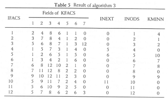 In the third algorithm separate linked lists are maintained of all the uncoupled faces which share the same smallest nodal number, i.e. have the same nodal number in the field N1 of the face record array KFACS. For this purpose the pointer vector KMINN, described in the section Face record, is used. KMINN(INODS) points to the first uncoupled face in the face record array KFACS for which INODS is the smallest nodal number. The linking vector INEXT is still used to provide the links to the other faces in the linked list. When the face IFACS, therefore, has been added to the face record array, it is only necessary to compare it with those faces in the link list associated with nodal number stored in the field Nl of the IFACS-th face record. If an identical face is found, it is removed from the linked list, otherwise the face IFACS is added to the list.