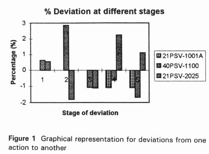 The results of the monitoring tests are tabulated in Table 2. One of the valves (21PSV-1Q01A) was only available as from after transportation to the workshop. Trevi tests were done at the different stages and a Leak test was also done after transportation to the workshop and after repair. This was done for comparison between the Trevi and Leak test set pressure values. From this comparison, the Leak test may show a set pressure of zero kPa, whilst the Trevi test shows a much higher pressure. This is because the Trevi-test apparatus is spring-force related. Table 3 summarises the percentage deviation from action to another as is shown graphically in Figure 1. For valve number 21PSV-1001A, a maximum deviation of -1.08% occurred during installation. For 40PSV-1100, a maximum deviation of 2.85% occurred during transportation to the workshop. A maximum deviation of 2.23% occurred for 21PSV-2025 during installation.