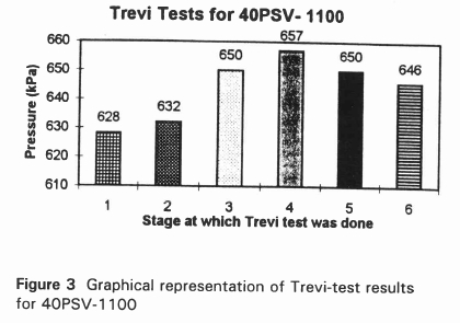 Table 5 shows the comparison between SASOL's Leak testing and Trevi testing. From this comparison, it is clear that Trevi testing cannot be compared to Leak testing at low pressures, but only for the higher pressures, 560 kPa and above. Also note that all the Trevi-test values are less than the 'First leak' values for the higher pressures. According to Table 5, the average difference between 'First leak' and the Trevi values are only 5.71% for the higher pressures.