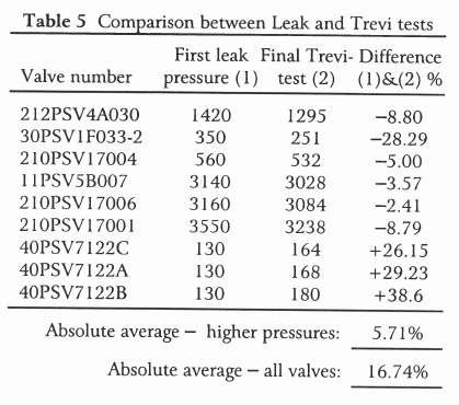 It is therefore possible that for pressures of 560 kPa and above one may compare Trevi testing with Leak testing for a newly overhauled valve. Table 6 shows that the difference between the original set pressure and the Trevi-test value, after a period of time, only differs more than 10% in one case. The absolute average deviation is only 5.03%) while in the case of the Leak testing the absolute average deviation is a high 42.81%. From this, it is clear that the spring stiffness of the valves did not deteriorate significantly with time, because the Trei test is spring-stiffness related.