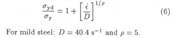 The empirical Cowper-Symonds constitutive equation,9 requiring two constants from experimental tests on a given material, can be used to assess the strain rate effects. It relates the dynamic yield stress σyd, to the strain rate έ, by the expression: