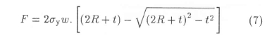 The second of the two equations was derived by calculating the deformation energy absorbed over a single roller using the perfectly plastic assumption. It relates the resistive force (F) to the roller radius, the strip thickness, strip width, and the material's yield stress, as follows:2