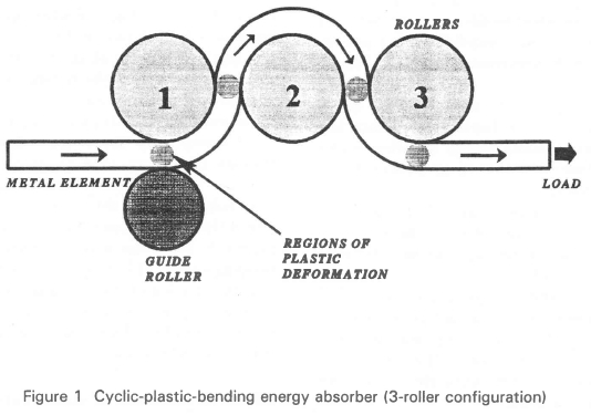 On 21 July 1964, Jackson,3 assignor to Van Zelm Associates Inc., filed a claim to a patent on an energy absorption device. The device relies on the principle that a large quantity of energy is absorbed when a metal element is cyclically subjected to plastic bending and unbending. The device consists basically of a long metal element (wire, strip, bar, etc.), being pulled through a set of rollers, as shown in Figure 1. As the element, in this case a metal strip, passes round each roller it is subjected to cyclic plastic bending. The plastic deformation of the metal element facilitates the conversion of the kinetic energy, of the object to be halted, into low level heat.