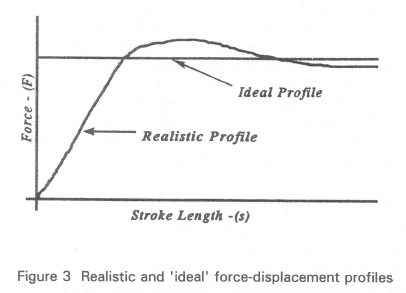 As the maximum amount of energy should be absorbed within these constraints, the ideal performance is given by an energy absorber that maintains a constant resistive force, at the maximum allowable level, over the full stroke length (Figure 3).6 In practice an instantaneous rise in force level is neither possible, nor desirable, and a finite onset rate is required (Figure 3).6 Due to the nature of the various mechanisms utilized it is found that the load-deflection characteristics of some energy absorbers differ substantially from this ideal profile.7
