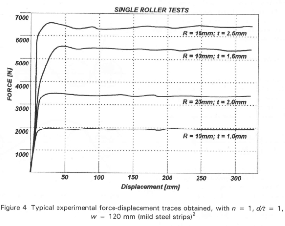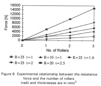 It can therefore be concluded that, at least for R/t-values between 8 and 25, the differential increase in resistance force is virtually equal for the first, second, and third rollers. Thus, for mild steel, at least up to the third roller, the multi-roller force will merely be a multiple of the single roller force, under quasi-static conditions.