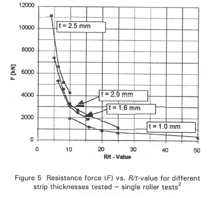 The resistance force results vs. R/t-valuesfor single roller experiments2 are shown in Figure 5. The R/t-values were varied between 4 and 50, for mild steel strip thicknesses of 1 mm, 1.6 mm, 2.0 mm and 2.5 mm (w - 120 mm, d/t = 1).