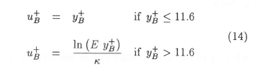 where the boundary point B is adjacent to the wall, therefore ub is the velocity at this point, yb is the distance from the wall to this point, and so on. Therefore the new terms introduced are the parameter, E, is the 'roughness parameter' and the term, κ, is the von Karman constant. The non-dimensionalised distance, yb+, is found from:
