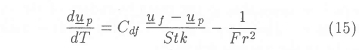 The up and ufare the velocity vectors for the particle and instantaneous fluid velocity. The equation is in non-dimensionalised form and T is non-dimensionalised time. The non-dimensionalised terms Cdf, Stk and Fr are introduced below. The coefficient term, Cdf, in the above equation is: