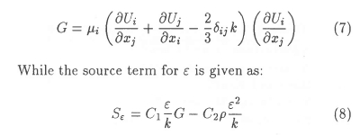 where k and εare substituted for φand μt/σk and μt/σεare substituted for Γφ, respectively. The terms, σk and σε, are empirical constants. The source terms for k is as: