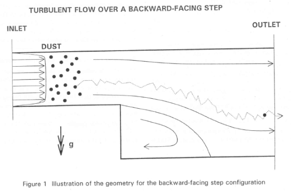 The flow problem considered in this study is planar turbulent flow over a backward-facing step. The experimental study used for the simulation has a very dilute doping of particles. Therefore we can make an additional simplification that the flow pattern is essentially uncoupled. It is one of the simplest forms of turbulent flow separation because the separation is caused by the change in geometry and the geometry is simple. In addition, this type of flow is used in a variety of ways in various applications, usually to create a recirculation region or a sudden change in pressure. However, our understanding of this flow is still incomplete. The flow configuration has been used considerably to develop and test turbulence models, in particular the k-ϵ model.21-30 It has not, however, been used to any great extent in the study of turbulent dispersion.