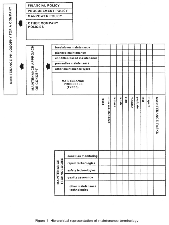 The definitions of the different terms used for concepts in maintenance are not clear and are often interchanged. It is therefore necessary to define exactly what the meaning of each term is and how they fit together hierarchically. Figure 1 contains a hierarchical representation of the interaction between the different terms. This figure is not meant to contain exhaustive lists of all possible examples, but just to serve as explanation of their hierarchical nature.