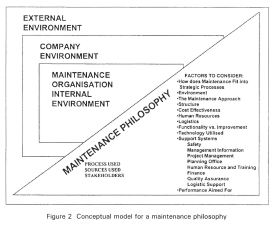 A conceptual model for a maintenance philosophy is illustrated in Figure 2 and the factors to consider in the development of a maintenance philosophy are discussed in the following paragraphs.