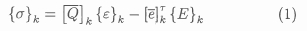 where {e} is the strain, {a} is the stress, {D} is the electric displacement, {E} is the electric field intensity, [Q] is the elastic stiffness matrix, [ë] is the piezoelectric stress coefficient matrix and [g] is the permittivity matrix. Non-piezoelectric laminae can be modelled by simply setting the piezoelectric constants to zero and retaining the dielectric permittivity constants if necessary.