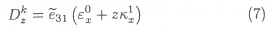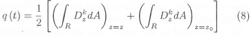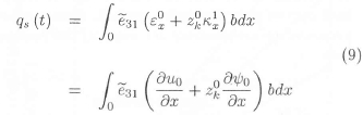 The equation (4) is used to calculate the output charge created by the strain in the smart beam. Since no external electric field is applied to the sensor layer, the electric displacement developed on the sensor surface is directly proportional to strain acting on the sensor. If the z-axis is the poling axis, the charge is collected only in the z-direction. Hence, only Dkz is considered. For a PVDF piezoelectric material layer acting as a sensor Ekz = 0 and equation (2) can be written as
