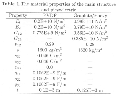 In the present smart beam structure, the piezoelectric of the bottom layer is considered as a sensor to sense the strain and generate the electrical potential and the piezoelectric of the top layer as an actuator to control the vibration of the structure. All material properties used are shown in Table 1.