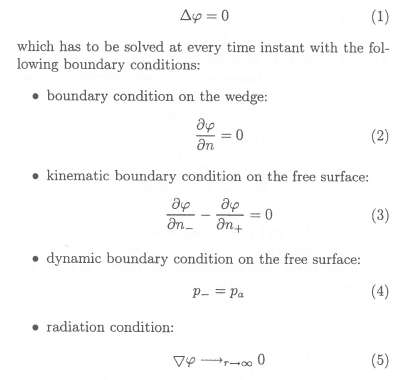 To solve the problem specified by equations (1) to (5), a vortex sheet with unknown intensity ϒS on the free surface and ϒb on the wedge is used. The vortex sheet intensities, ϒS and ϒb are found from the boundary conditions (2) and (4). The kinematic boundary condition (3) is satisfied automatically if one assumes that the free surface follows trajectories of fluid particles lying on the free surface:
