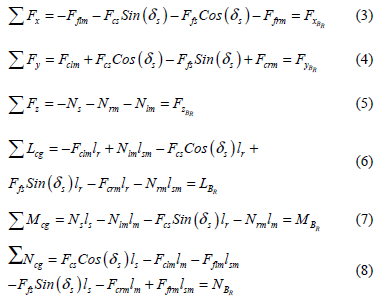 Figure 6 shows a three-dimensional top, rear and side view suspension system. The subscripts lm, rm and s denote the left main, right main and steering wheels respectively and the subscript BR denotes the runway body axis system. With the various runway forces acting on each wheel identified and modelled, the resultant forces and moments acting on the aircraft can be written as follows,