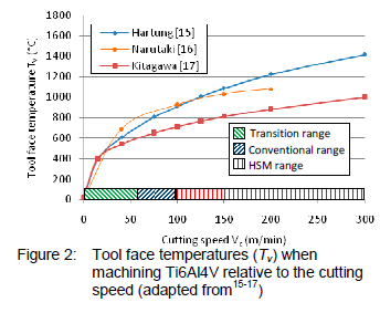 The recommended cutting speeds (Vc) for titanium alloys of over 30 m/min with high speed steel (HSS) tools, and over 60 m/min with cemented tungsten carbide (WC) tools, result in rather low productivity8. The machining challenges can be divided into thermal and mechanical tool demands. The tool face temperature (Tv) is a function of the cutting speed (Vc) and exposure time to this thermal load. The longer the duration of exposure time, the larger the volume of the tool edge, that is exposed to the critical tool temperature12. The combination of titanium's low thermal conductivity and the fact that approximately 80% of heal generated13 is retained in the tool; result in a concentration of heat in the cutting zone (thermal stress). These issues cause complex tool wear mechanisms such as adhesion and diffusion14,15. Figure 2 illustrates the results from studies of the tool face temperature (Tv) when machining Ti6A14V relative to cutting speed (Vc). Similarly, other researchers16,17 also measured temperatures of 900 °C at a cutting speed of 75 m/min.