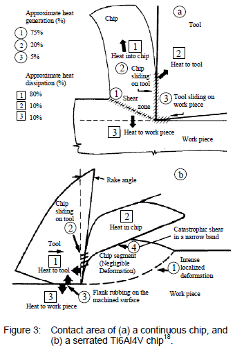 The mechanical demands arc a combination of the work piece chip load on the cutting edge and machining vibrations. Ti6A14V exhibits segmented chip format ion and has been cited to cause much confusion in interpreting cutting data12 in the pre 1980 era. Figure 3 illustrates a general continuous and serrated Ti6A14V chip. The contact area of a serrated chip is found to be only a third10 of the contact area of a continuous chip.