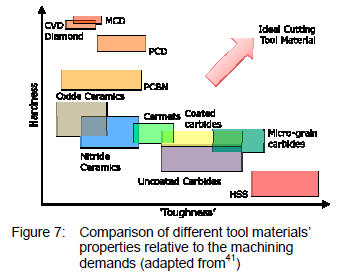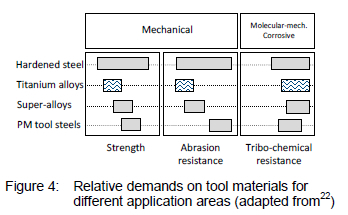 This results in high pressure loads on the cutting edge. Catastrophic tool failure, due to vibration while in cut, is caused by self excited chatter19 and forced vibrations due to the formation of shear localization18 and the fluctuating friction force between the tool and chip flow. According to Shivpuri et al.20 the chip segmentation phenomena significantly limits the material removal rates and causes cyclic variation of force. The combination of a low Young's modulus (114 GPa)21, coupled with a high yield stress ratio allows only small plastic deformations6 and encourages chatter and work piece movement away from the tool. Figure 4 illustrates the demands on the cutting tool material for different application areas in terms of strength, abrasion resistance and tribo chemical wear resistance.