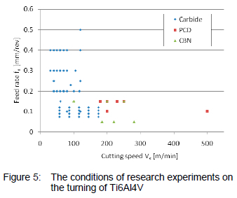 Although experiments wit h carbide are conducted al higher cutting speeds, advisable industry norms for first stage (roughing) turning is still limited to cutting speeds of 30-50 m/min and feeds of 0.3-0.4 mm per rotation27. Finish turning operations are done at cutting speeds ranging from 80-120 m/min and feeds of 0.1-0.2 mm per rotation. From this figure it is evident that high speed machining is still a new titanium machining strategy and that not many experiments have been conducted with PCD and CBN tools. The performance of conventional tool materials are poor when machining Ti6A14V at elevated speeds and the development of cutting tool materials such as CBN and PCD may hold the answer to higher cutting speeds.