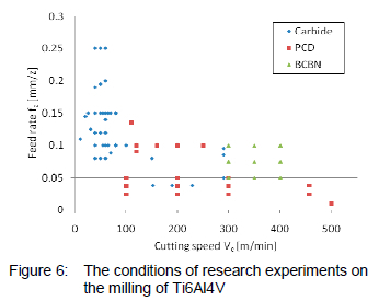 The key demand that distinguishes milling from turning is the interrupted cutting and the related mechanical and thermal shock loading. In milling the tool is subjected to cyclic heating and cooling, causing thermal shock. When the rate of cooling is increased significantly, the result is tool crack formation causing premature tool failure28. Su et al.29 connect cyclic thermal shock directly with thermal crack initiation. It logically follows that an indiscriminate increase of cooling power will yield diminishing returns. Tool wear in milling of TiGAI4V may be modelled as a thermo mechanical high cycle fatigue phenomenon in which the first order effects can be divided into work piece related and catastrophic tool failures22. Figure 6 illustrates the different cutting conditions of research experiments7,12,29-33 on the milling of Ti6A14V. Similar to turning, carbides are used for roughing (conventional speed, high feed) while experiments with PCD and binderless cubic boron nitride (BCBN) show promising results for high speed finishing operations. As indicated in the figure, the rough milling34 of titanium alloys is also defined by conventional cutting speeds (around Vc =50 m/min), but a lower feed per tooth limit (fz = 0.25 mm/z) is evident compared to that for turning (fa =0.5 mm/rev). This clearly demonstrates the higher mechanical and thermal shock loading found in milling operations. Rough milling operations are still limited to cutting speeds of 30-60 m/min35,36 with feed rates of 0.1 - 0.25 mm/z35,36.