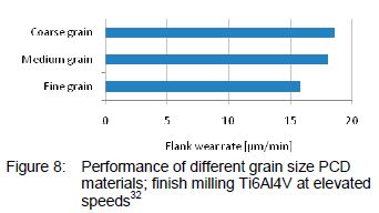 Similarly, there is an inverse relationship between the grain size (increase in TRS), and wear performance. Research studies51 indicated that the performance of fine grain PCD in experiments is a manifestation of the phenomenon envisaged by Barrien Ritcey12, namely that a tool material with sufficiently high temperature performance will be able to yield better machining productivity through the utilization of the thermal softening of Ti6A14V by means of an α-β phase change.