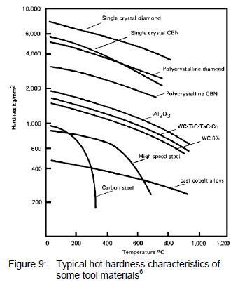 Advances in cutting tool materials have resulted in an increase in material removal rate (MRR) when cutting titanium alloys. Cutting materials will always encounter extreme thermal and mechanical stresses close to the cutting edge during machining, due to the poor machinability of titanium alloys4. Therefore, the tool material's hot hardness6 is a major requirement for Ti6A14V machining tools. The softening temperatures of commercially available cutting materials are given in figure 8. Most tools lose their hardness at elevated temperatures, caused by the weakening of the inter particle bond strength and the consequent acceleration of the tribo chemical tool wear.