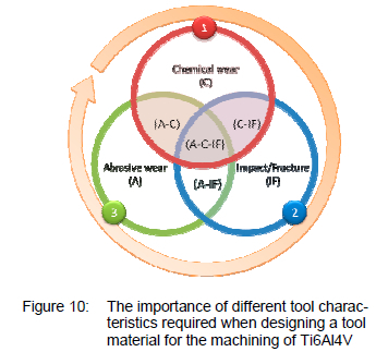 As illustrated in figure 10, the chemical wear resistance of the tool material is the first priority, followed by impact and abrasive wear resistance. Table 1 summaries the perform anee of different cutting materials used to titanium alloys. As indicated in the table, although PCD materials perform well, it is still a very expensive cutting material that needs further development.