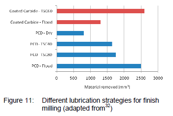 Lubrication and cooling strategies for titanium machining operations are areas where the cutting process can be improved. During interrupted cutting the tool is subjected to cyclic heating and cooling that can cause thermal shock12. When the rate of cooling is increased significantly, the result can be thermal shock, causing catastrophic tool failure, if the thermal load (at elevated cutting speed) is too high for the tool material . Su et al.29 connect cyclic thermal shock directly with thermal crack initiation. The low thermal conductivity of Ti6A14V causes a concentration of the heat build up in the cutting zone'. When the cutting zone is shielded from the lubricant stream such as in cutting with deep axial immersion, the coolant needs to be focused on the cutting edge52. At high tool temperatures, typically above 550 °C, the heat transfer mechanism between the cooling fluid and the tool surface changes to two phase high speed flow12. The coolant is vaporized on contact with the heated tool surface, forming an insulating boundary layer on the tool surface. The phenomenon is also described as delayed surface wetting in heal transfer literature12. The performance of the different lubrication strategies for finish milling with PCD is illustrated in Figure 11. Coaled carbide tool materials with flood lubrication were used as benchmark.