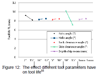 Titanium alloys are used for high value components, not only components used in an aircraft's frame and engine, but also in the biomedical field. Workshops able of sustained growth will migrate toward higher end work, meaning that a gtowing percentage of machining shops will encounter titanium alloys. Therefore attention to milling titanium is worth while in order to achieve higher productivity, when raising the cutting speed is not an option. Results55 from research collaboration study details the effect of tool geometry on tool life. As illustrated in figure 12, the side clearance angle of the tool is the most influential.