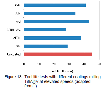 Another solution to protect tool materials from thermal load is the use of a coating. The perfect coating should have a high temperature resistance, a high toughness and limited thickness in the sub 10 micron range. Figure 13 shows results of different experimental coatings milling Ti6A14V. None of these coatings improved tool life relative to the uncoated tool. It should however be noted that coatings like TiSiN were not tested in this study".