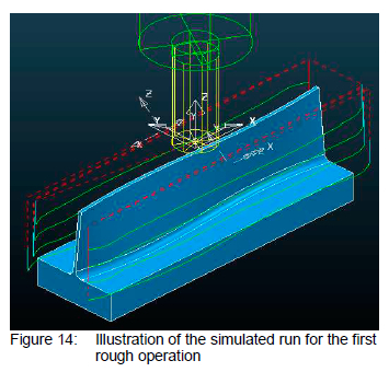 The revision of the machining strategies with new generation cutting tools showed a significant reduction from 116 to 41 minutes in the total machining time. An aluminium version of the same benchmark component required nominally 14 minutes to machine. Compared to the 41 minutes to machine a Ti6A14V part, it is evident why titanium machining needs further experimentation. Figure 14 illustrates the first roughing operation of this component.