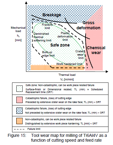 Tool failure can be initiated by one or a combination of several forms of wear, which in an advanced stage may lead to overload or fatigue and catastrophic tool failure22. Note that flank and crater wear are gradual and more predictable than fracture, which occurs suddenly. The key to designing high performance cutting tools is to identify the most economical scheduled replacement time (SRT) used in the industry for the specific component. Thus the tool suppliers can optimize the operational conditions, whereby the cutting tool will withstand the demands of the machining process for a longer period of lime than the SRT. These optimum operational conditions are defined as the safe zone12,41. The following section examines the performance of different tool materials for machining Ti6A14V.