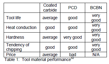 The term toughness should be interpreted not necessarily as the engineering quantity, fracture toughness, but more so as the resistance to chipping or catastrophic failure22. Figure 7 shows that there are always trade-offs between higher cutting speeds and higher feed rates. The tougher high speed steel (HSS) and Micro-grain cemented carbide are predominately limited by their hot hardness (property to withstand the thermal load), whereas PCD, being deformation resistant at higher temperatures, is primarily limited by its toughness (property to withstand mechanical loading).
