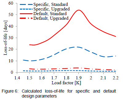 Using the program shown in figure 4, a loading curve was computed for both default design parameters and specific design parameters. The default parameters were selected based as per IEC 60076-7:20053, while the specific parameters were determined using the equations in section 2.3. Furthermore, the resulting loss-of-life for both standard paper and thermally upgraded paper was computed.