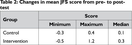 The mean scores of the pre- and post-JFS (the Feelings of Inadequacy Test) were calculated, and the difference between the pre- and post-tests was determined (Table 2). A negative value indicated a decrease in self-esteem and a positive value indicated an increase in self-esteem.