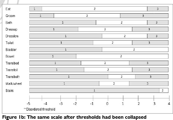 The aim of this investigation was to discover if the points on the rating scale indicate an increasing amount of the ability of a person to participate in everyday activities. When scales measure the abilities of people, they should clearly indicate that people with higher abilities would pass more items on the scale than those with less ability. This measurement is only possible if the categories or points in the scale are ordered from low to high. The thresholds are those distances between two points on a scale. When the thresholds of an instrument are ordered according to the Rasch Model, each point or category is represented on a line as indicated in an example analysis in Figure 1a and 1b. Figure 1a indicates that only three items were ordered on a scale of 1 - 7. The analysis indicated that the rest of the items could not be measured on a 1 - 7 point scale. When this happens, one has the option to collapse points or categories (e.g. collapse point 2 and 3 as one category) as indicated in figure 1b. When the scale was redesigned with only three thresholds for most items, and in some items like bladder and bowel and stairs, only two thresholds, all items appeared linear. With the example below, it became clear that certain items like eating, grooming, bathing etc. cannot be measured on a scale of 1 to 7 as originally designed but that a 1 to 3 scale is a more valid scale to measure a person's ability for specific items. This process is called threshold ordering in the Rasch Model7.