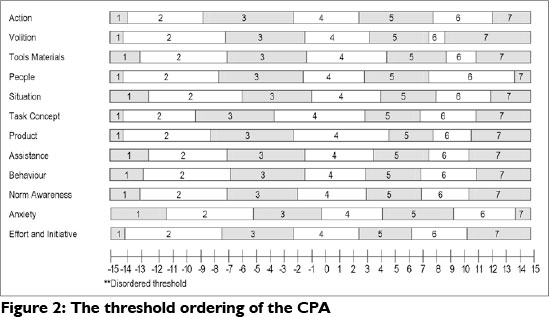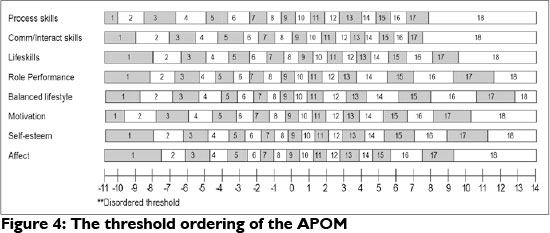 The ordered thresholds hold great significance for occupational therapists using any of the three instruments. The significance lies in the fact that mathematical calculations may be done: for instance scores of the individual items of the instruments may be summed to obtain a total score, means and averages may be calculated as well as effect sizes (difference between final and baseline score). However, this significance must be viewed in light of the rest of the requirements of the Rasch Model. Threshold ordering is but one of 10 requirements8 before an instrument may be used as a measure with linear or interval scores. The remaining analyses such as item functioning, local dependency between items, unidimensionality and item-person fit still need to be reported on these three instruments.