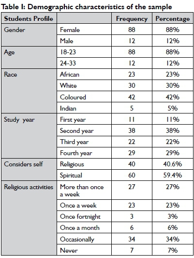 A quantitative, descriptive cross-sectional design was used for this study. Convenience sampling was used to recruit 198 potential participants for the study of which only 103 participants from all years responded to the online questionnaire. The questionnaire was distributed to all participants via email in a form of a link developed using Google Forms and participants were consistently reminded about the study via email. However, three participants were excluded due to missing data on their responses. Therefore, the final sample comprised 100 undergraduate occupational therapy students. The participants managed to complete the online questionnaire in the computer laboratory within 30 minutes. The participants' responses were automatically entered onto a Google spreadsheet.