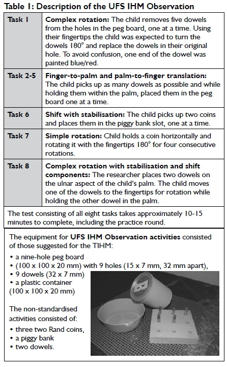 The FSU IHM Observation Checklist was developed from non-standardised activities and standardised tests published in the literature to ensure the assessment of all the components of IHM. A short description of each activity, photographs of these activities and the scoring of the UFS IHM Observation Checklist is presented in Table I.