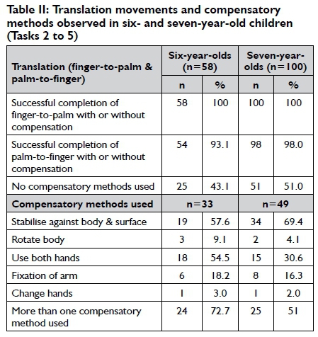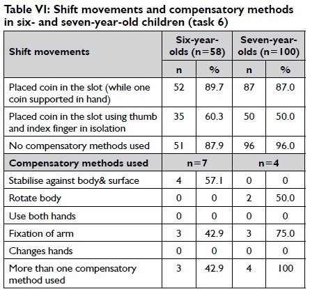 During the completion of the translation tasks, the six-year-olds used more compensatory methods than the seven-year-olds. This may be due to the fact that the biomechanical structures of the hand and other related motor skills are more developed in seven-year-olds. This finding correlates with those of Exner3 who indicated that IHM continues to develop until the age of twelve years. The most common compensatory method used during translation was stabilisation against the body and a surface, which occurred in both age groups, although more frequently in the seven-year-olds. Using more than one compensatory method was more common among the six-year-olds however. The fact that the six-year-olds used other compensatory methods may explain why fewer children in this age group used stabilisation against the body and a surface and dropped less dowels during the completion of this task.