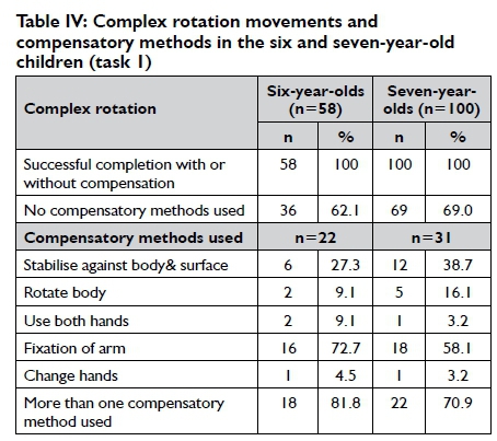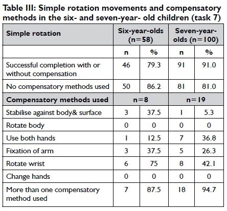 According to Case Smith8, simple rotation should be developed in children between three-and-a-half and five-and-a-half years. This is congruent with the observation that the majority of the six- and seven-year-olds was able to perform simple and complex rotation (with or without compensation). In simple rotation the most common compensatory method used was rotation of the wrist in both age groups while fixation of the arm was more common during complex rotation. The use of more than one compensatory method occurred more amongst the seven-year-olds, possibly resulting in the seven-year-olds dropping less dowels during simple and complex rotation.
