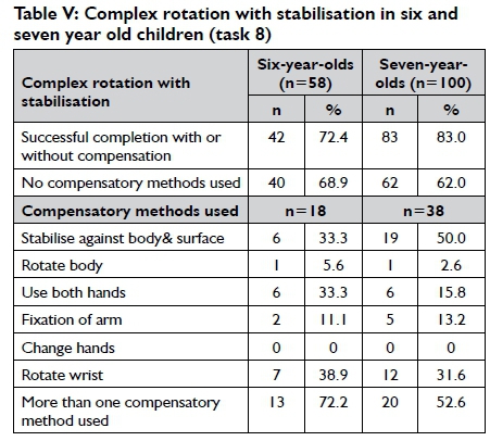 Table IV on page 56 indicates that all the participants were able to pick up dowels, one at a time, as well as turn each dowel 180°. Both groups (81.8% of six- and 70.9% of seven-year-olds) used more than one compensatory method. Ten (17.2%) of the six- and six (6.0%) of the seven-year-olds dropped a dowel during completion of this task.
